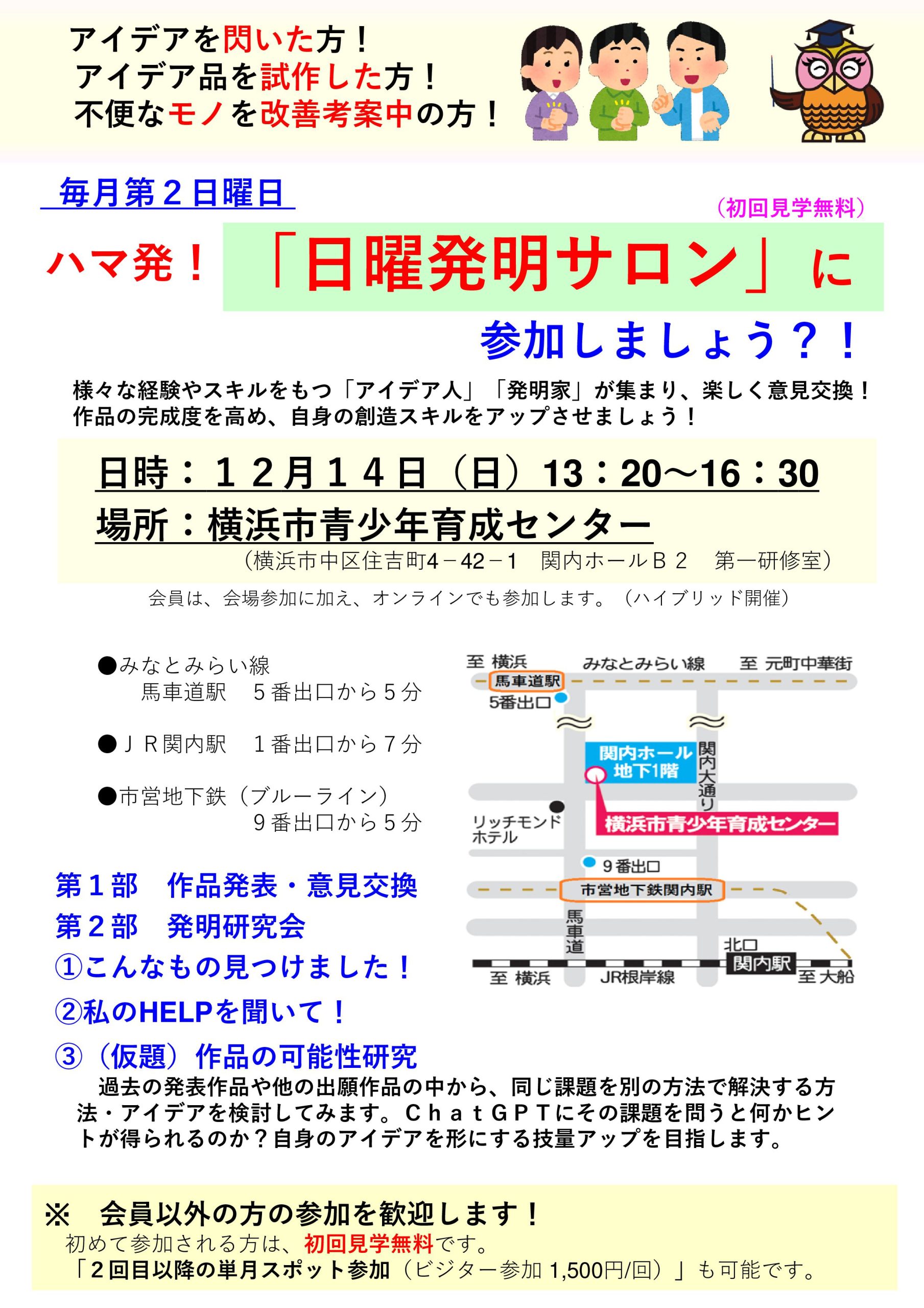 *12/14「日曜発明サロン」に見学参加をご希望の方は、12/13(土)17:00までに、当会メールアドレスinfo@yokohama-hatsumei.com宛ご連絡ください。