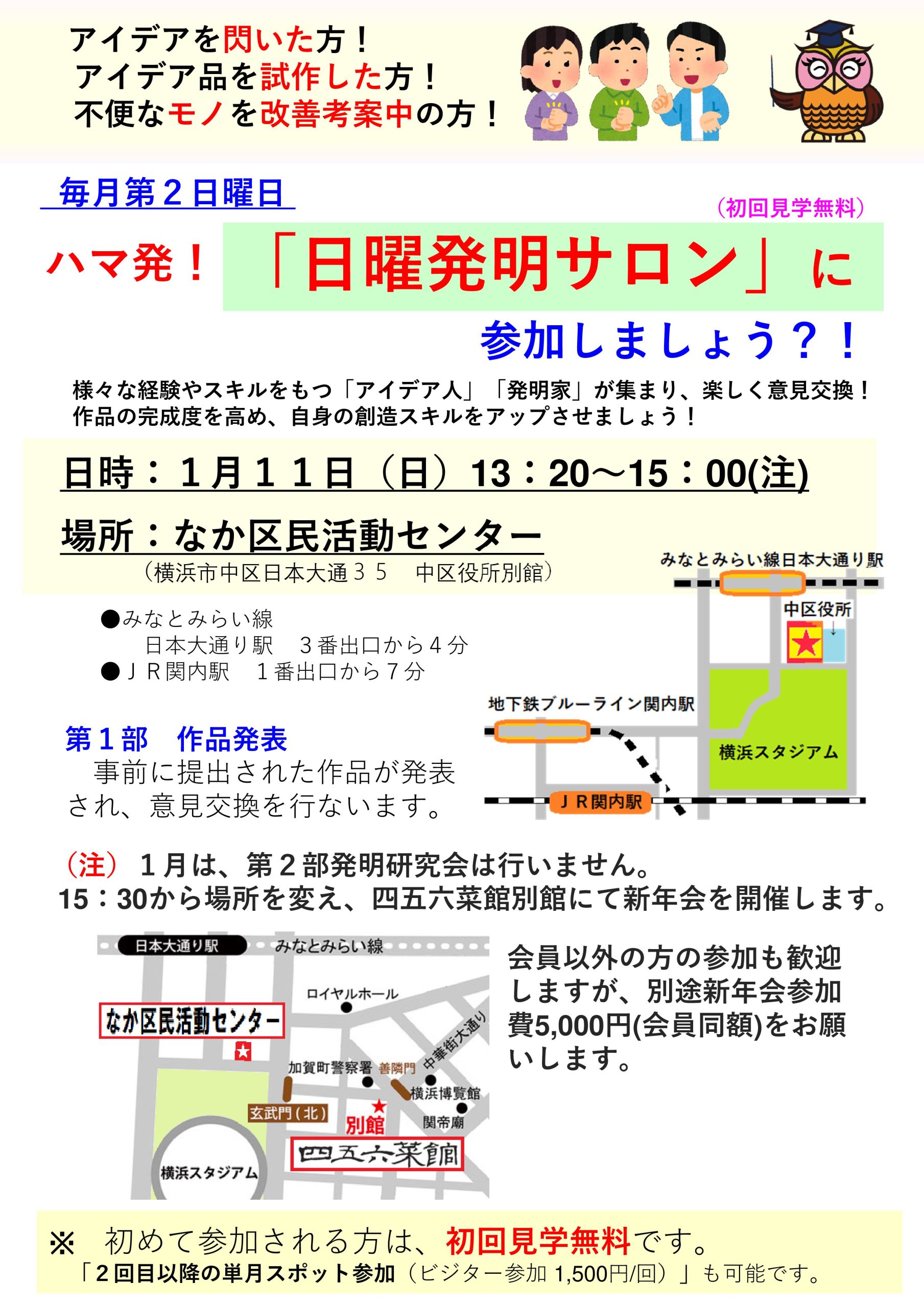 *1/11「日曜発明サロン」に見学参加をご希望の方は、1/10(土)17:00までに、当会メールアドレスinfo@yokohama-hatsumei.com宛ご連絡ください。